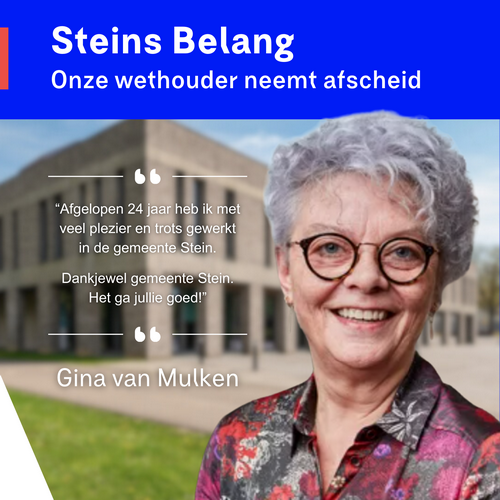 Na zich 24 jaar politiek in te hebben gezet voor de Gemeente Stein, kondigt wethouder Gina van Mulken vanwege een samenloop aan omstandigheden haar afscheid van het college van burgemeester en wethouders in Stein aan. Per 1 mei zal zij de gemeente verlaten. In totaal was ze 13 jaar actief als wethouder, 10 jaar als raadslid en 1 jaar in commissies.